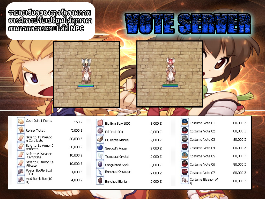 • 1. กดโหวตเซิร์ฟเวอร์ อังคาร-ศุกร์ X2, เสาร์-อาทิตย์-จันทร์ X3 สะสมแต้มโหวต แล้วนำมาแลก Item ในเกม